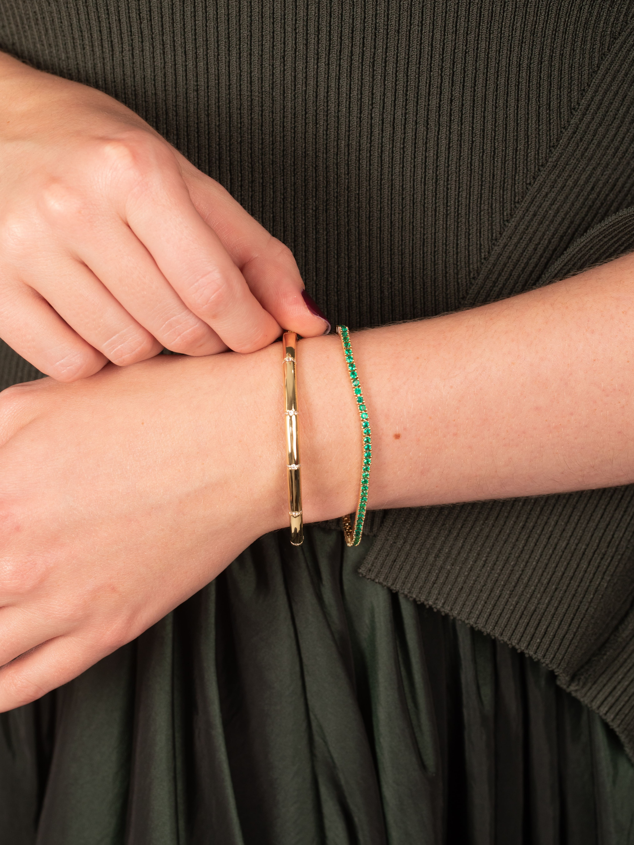 The deep green sparkle of the stones beautifully complements the warm gold plating, creating a look that’s equal parts classic and modern. Perfect for stacking with your favorite gold bangles or wearing solo as a statement of refined style, this bracelet adds a touch of sophistication to any occasion.