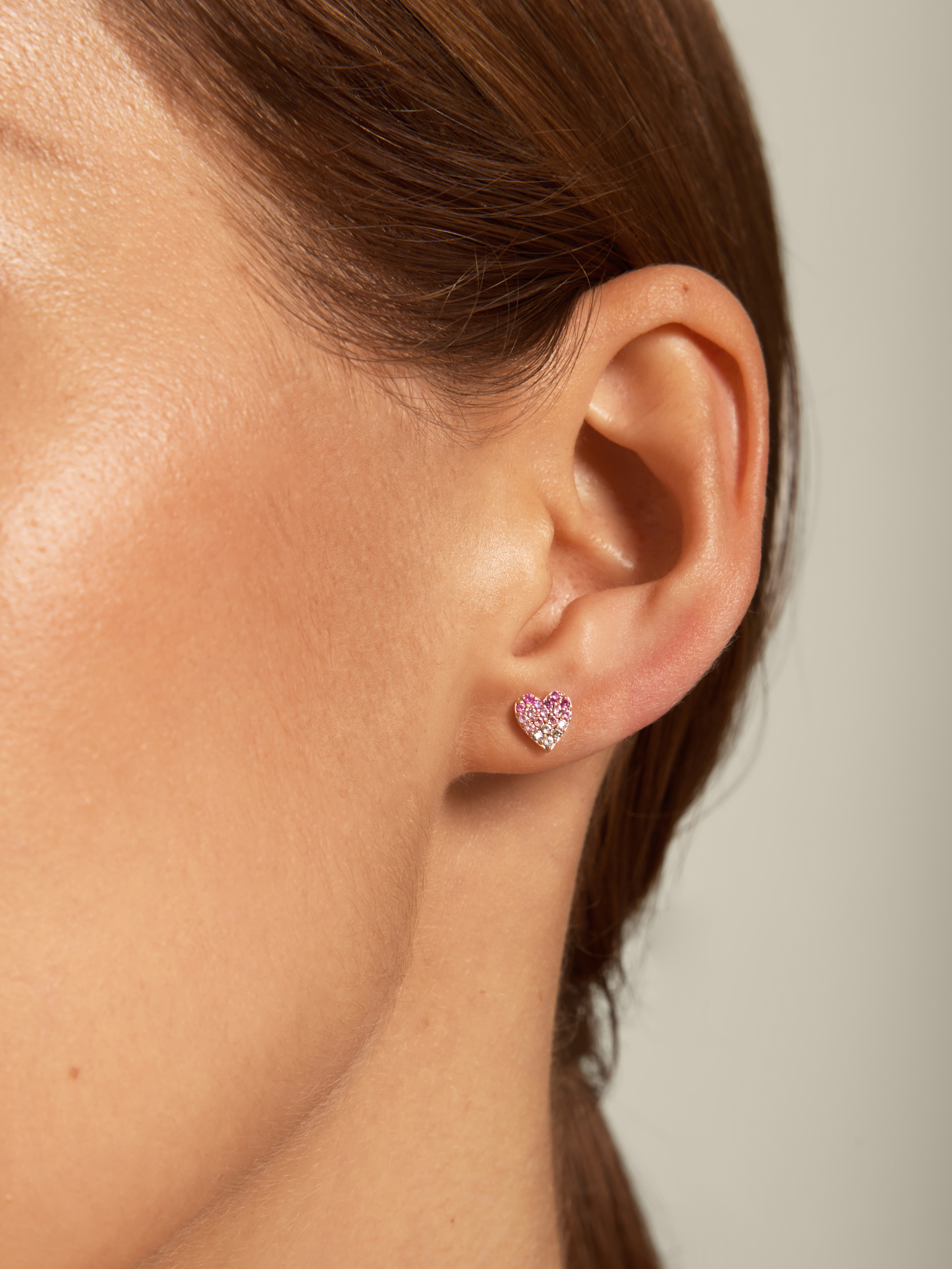 Fall in love with color. Our Pink Ombre Sapphire Stud Earrings feature a stunning gradient of natural pink sapphires and white sapphires set in 14k gold. The heart-shaped design adds a playful touch, while the ombré sparkle brings a fresh, modern feel to a timeless silhouette.