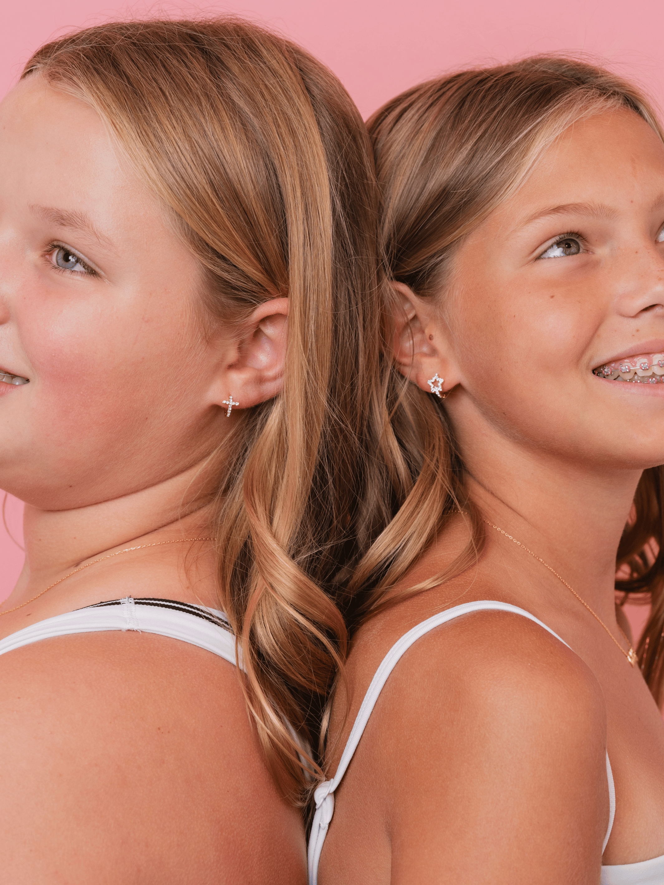 To keep your CZ Cross Huggies sparkling and secure, we recommend removing them before showering, swimming, or working out. These huggies are crafted with care, and some styles use adhesive to hold the stones in place—exposure to water or sweat over time can loosen the setting.