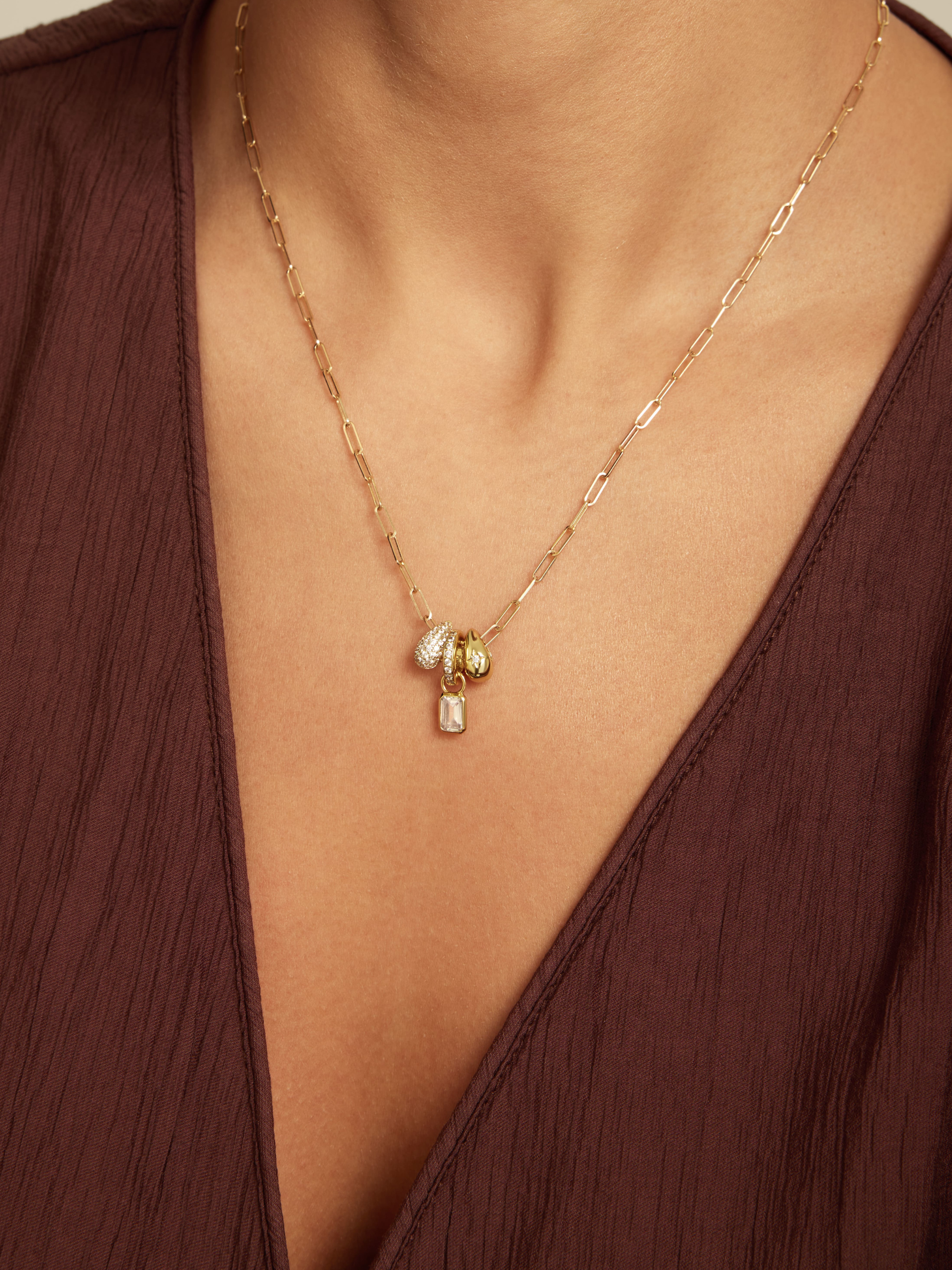 Meet the Lucy Bezel Charm Necklace, your new go-to for sparkle with a feminine twist. Designed in 14k gold-plated brass, this necklace features a chic mix of charms: a pavé teardrop, a smooth gold drop with star detail, a CZ rondelle, and a dazzling emerald-cut CZ charm. All set on a modern paperclip chain, Lucy shines whether worn solo or layered with your favorite necklaces.
