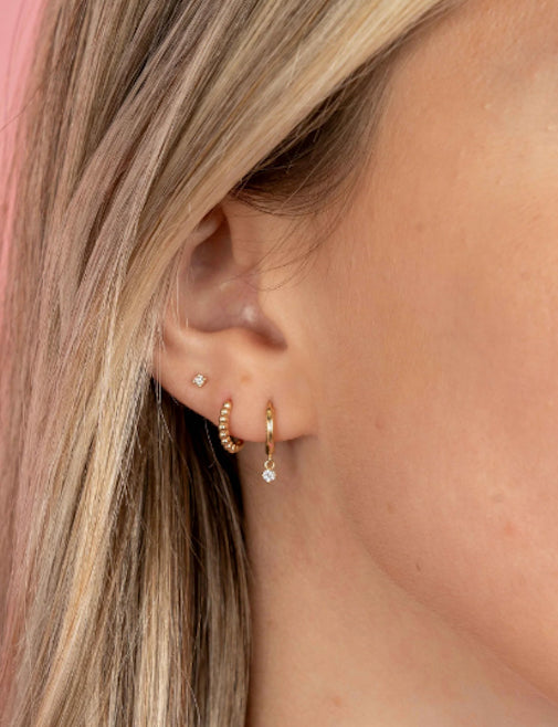 Fancy up your everyday look with these charmed huggie earrings. Crafted with 14K yellow gold, with a dangle prong diamond - perfect for every occasion.